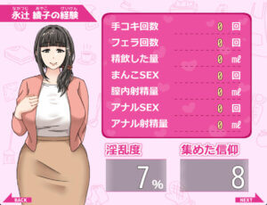 息子「はると」を助けるために街をまわってバイトや人助けをこなし、「信仰」を集めましょう!信仰ポイントをある程度集めると、レイに話しかけて病院へ行き、陰気を取り除くことではるとの容態が良くなっていきます。息子の治療が街でのイベントの進行度になっており、治療が進むごとにエロイベントのが過激になっていきます。エンディングは9つあり、それぞれ段階エロイベントを最後まで見るかどうかで分岐するので、全て回収するのは難しくないかと!