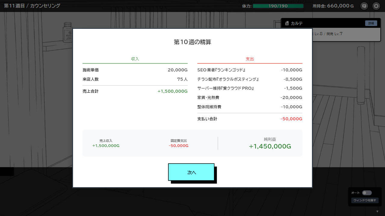 - 借金を返せないと遅延損害金で1割追加される。最低返済額を返すようにしよう。4周目当たりから黒字になってくる。6周目ぐらいからはアイテムが揃ってれば数十万づつ黒字になるのでそこまで必死にならなくてもOK。最終的には+145万。上限50万なので注意。半分返済でタツ姐マッサージ