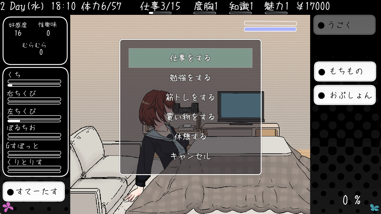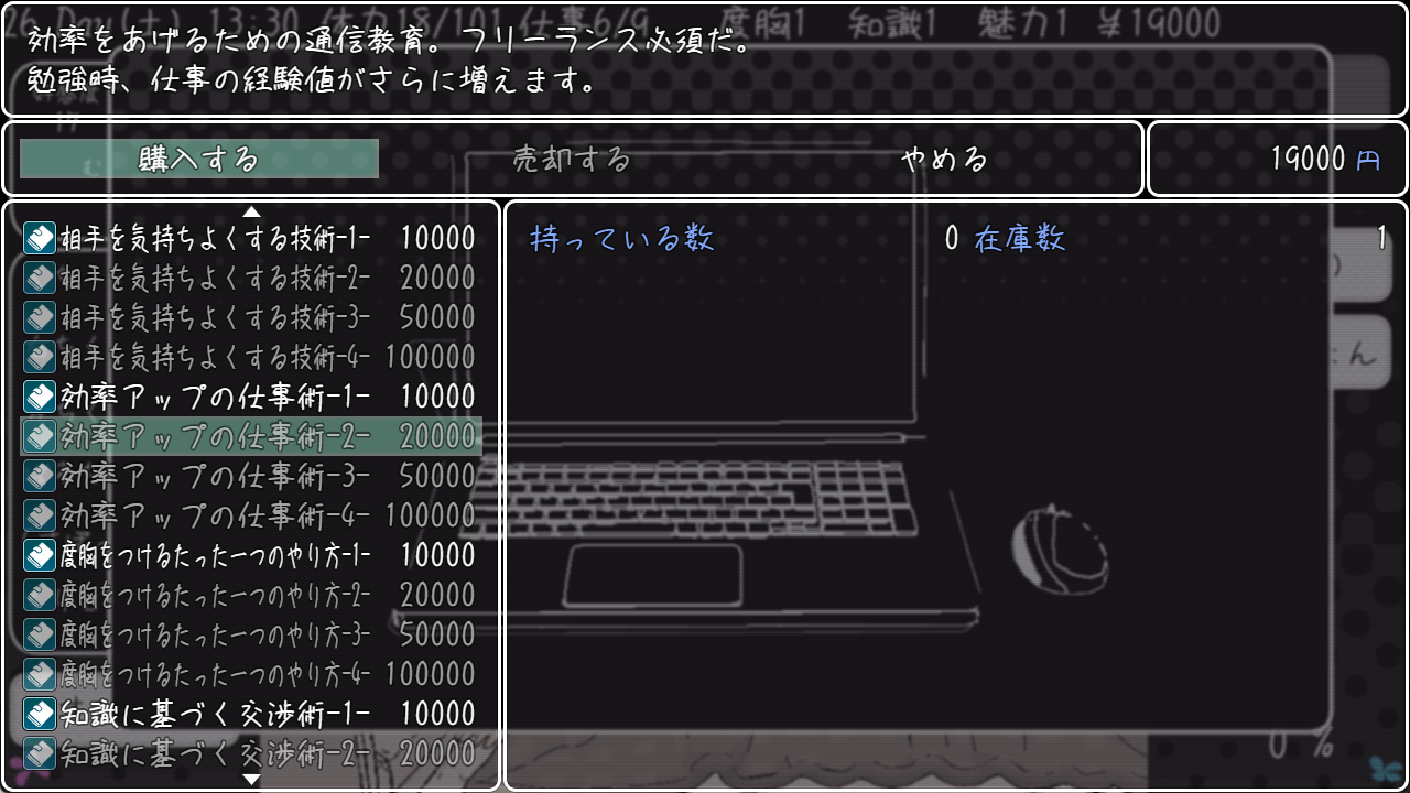 仕事でお金を稼ぎ、アイテムを買うことでパラメータが上がりやすくなる。